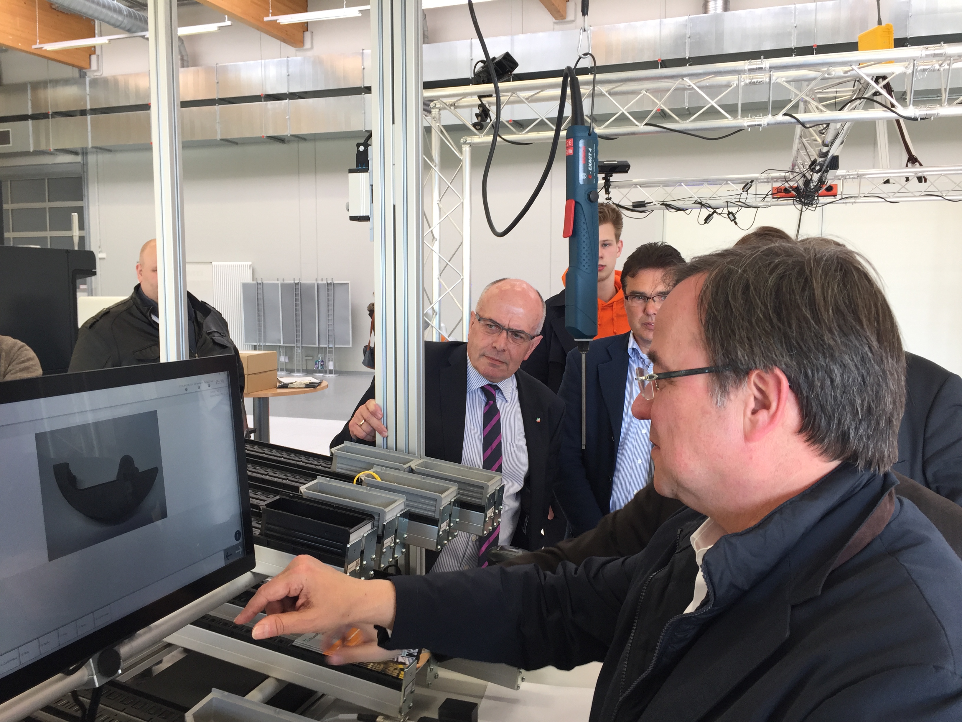 Armin Laschet besuchte die Hochschule OWL und zeigte sich begeistert von den Möglichkeiten, die ihm Professor Dr.-Ing. Stefan Witte und Professor Dr.-Ing. Jürgen Jasperneite vorstellten. Als CDU-Landtagsabgeordneter aus Lemgo wirbt Walter Kern gern für die Vorreiterrolle seiner Heimatstadt beim Thema Industrie 4.0 und hatte sich für den Besuch stark gemacht. "In Lemgo wird Zukunft ermöglicht!", waren sich Armin Laschet und Walter Kern einig.